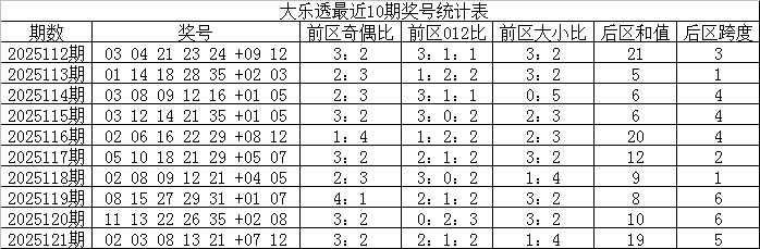 大乐透第25121期开奖,前区奖号:02、03、08、13、21;后区奖号:07、12。其中前区奖号012路比为2:1:2,大小比为1:4,奇偶比为3:2,后区开出1路+0路奖号。