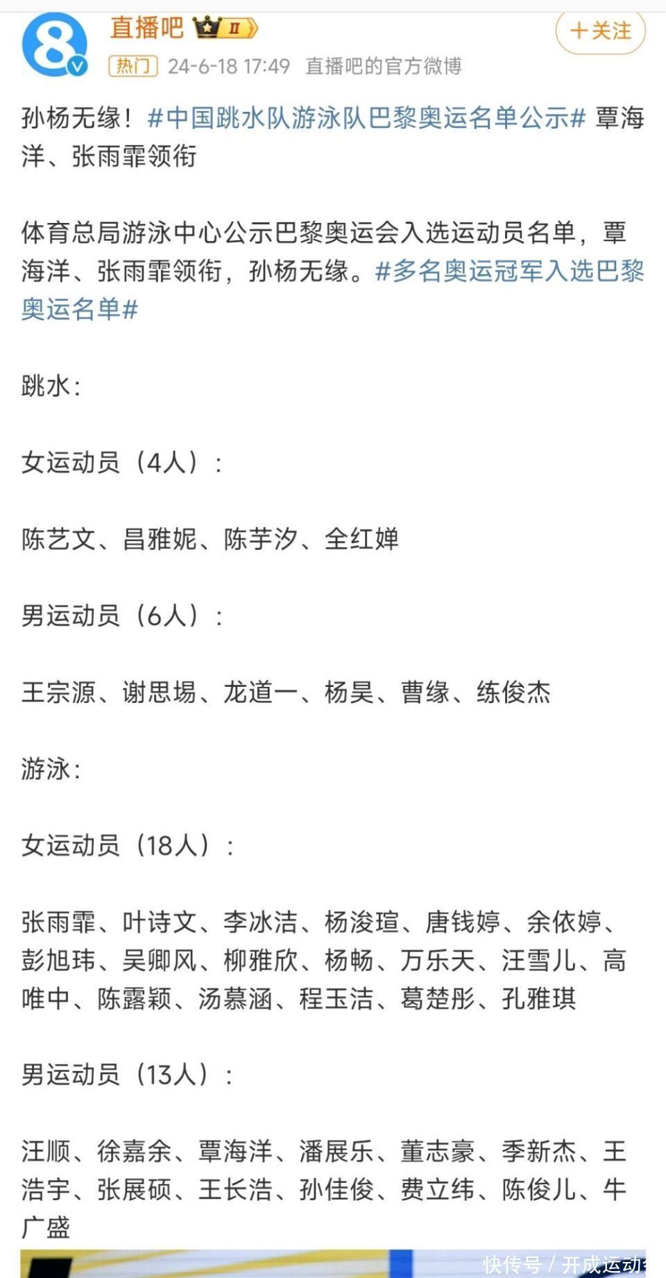 6月18日,总局游水中心公布了中国游水队参预巴黎奥运的大名单,解禁复出的孙杨无缘巴黎奥运会。有网友示意:畅通员没必要防备非议,不是艺东说念主,一切以收成说,独一孙杨粗略归附现实堂堂正正再拿寰宇冠军,翻脸一切质疑一切非议,齐九霄,孙杨依然是据说。