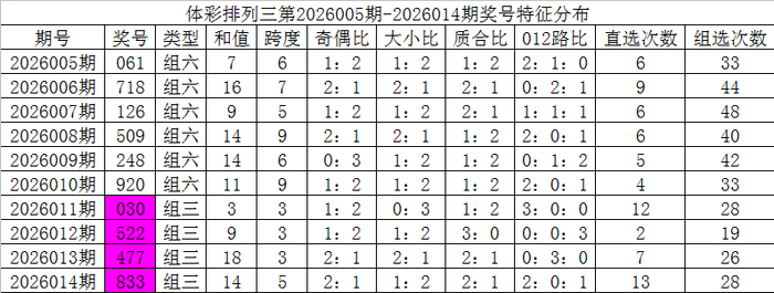 开奖公告:体彩摆设三第2026014期开出奖号:833。组三,无重号,奇偶比2:1,大小比1:2,012比2:0:1,和值14,跨度5。